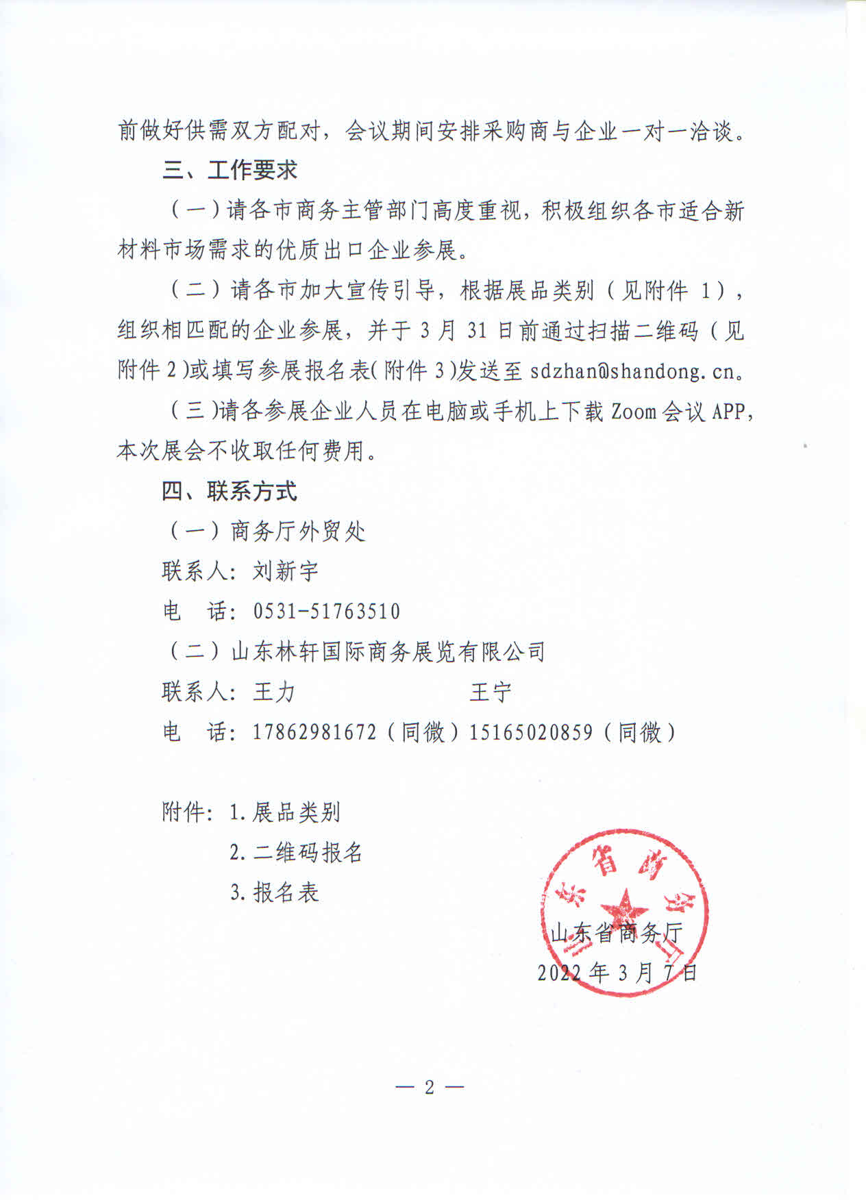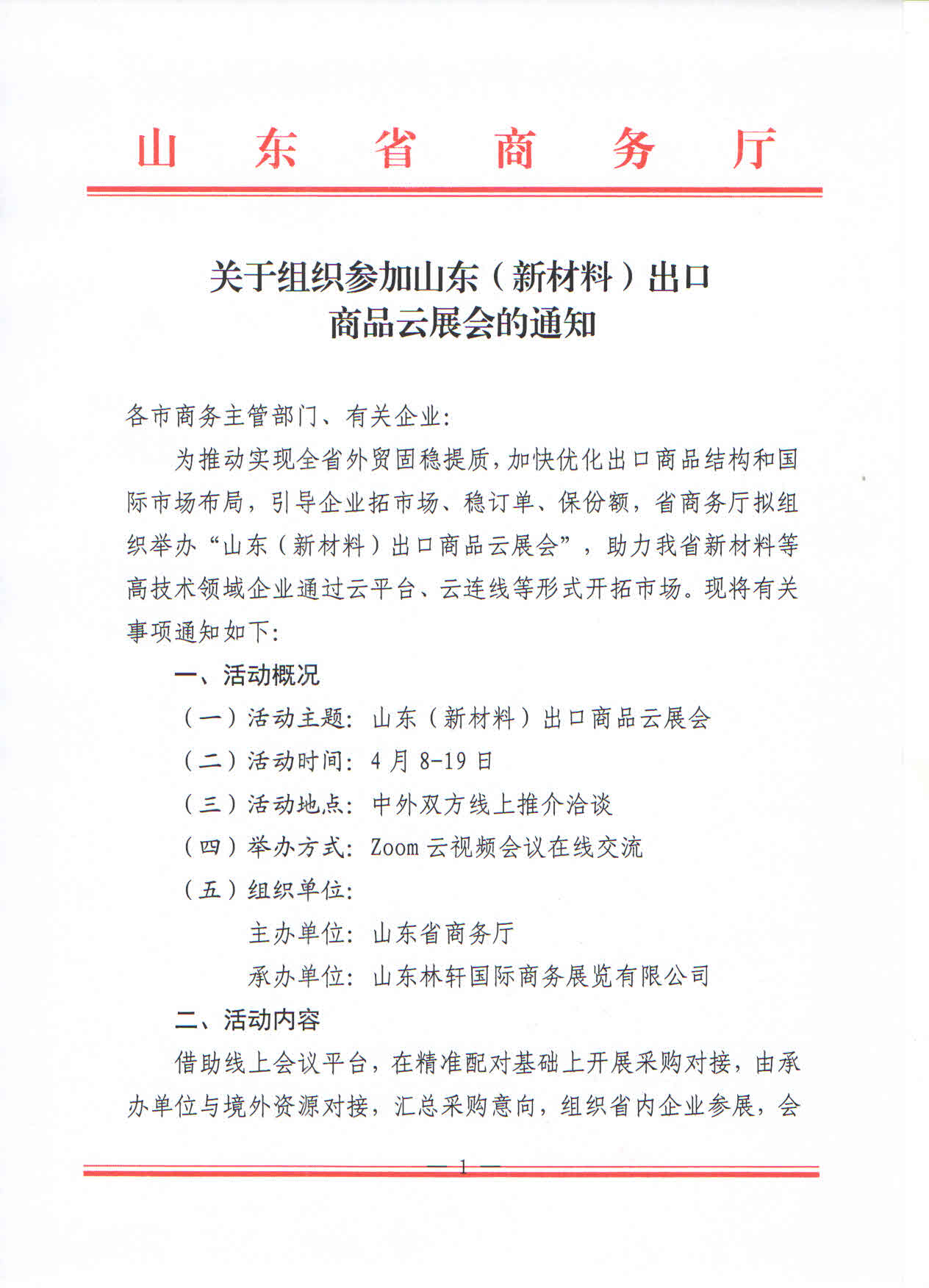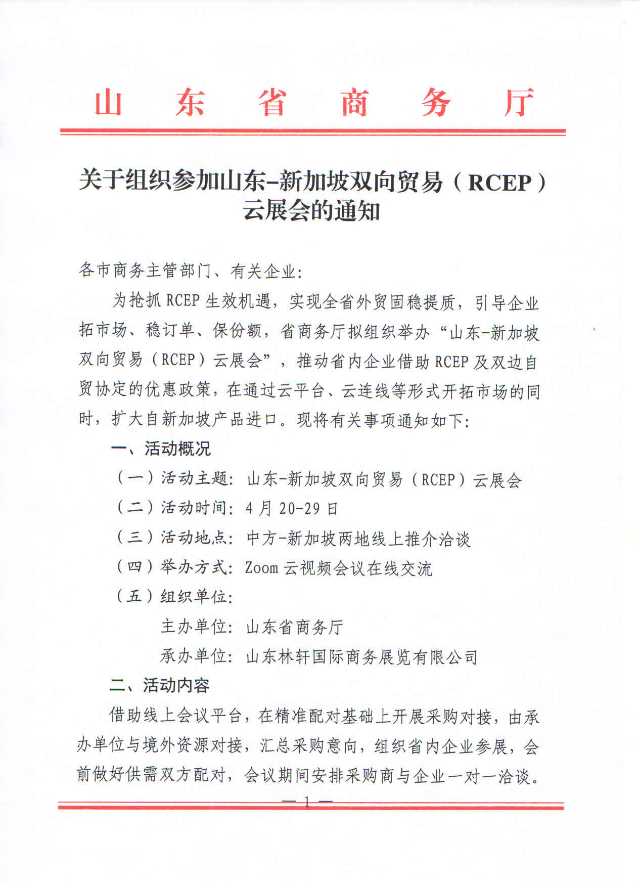 为推动实现全省外贸固稳提质、抢抓RCEP生效机遇,加快优化出口商品结构和国际市场布局,助力企业拓市场、稳订单、保份额,由山东省商务厅主办,山东林轩国际商务展览有限公司承办的山东(新材料)出口商品云展会、山东-新加坡双向贸易(RCEP)云展会即将开启,企业免费参加,欢迎企业踊跃报名参与!